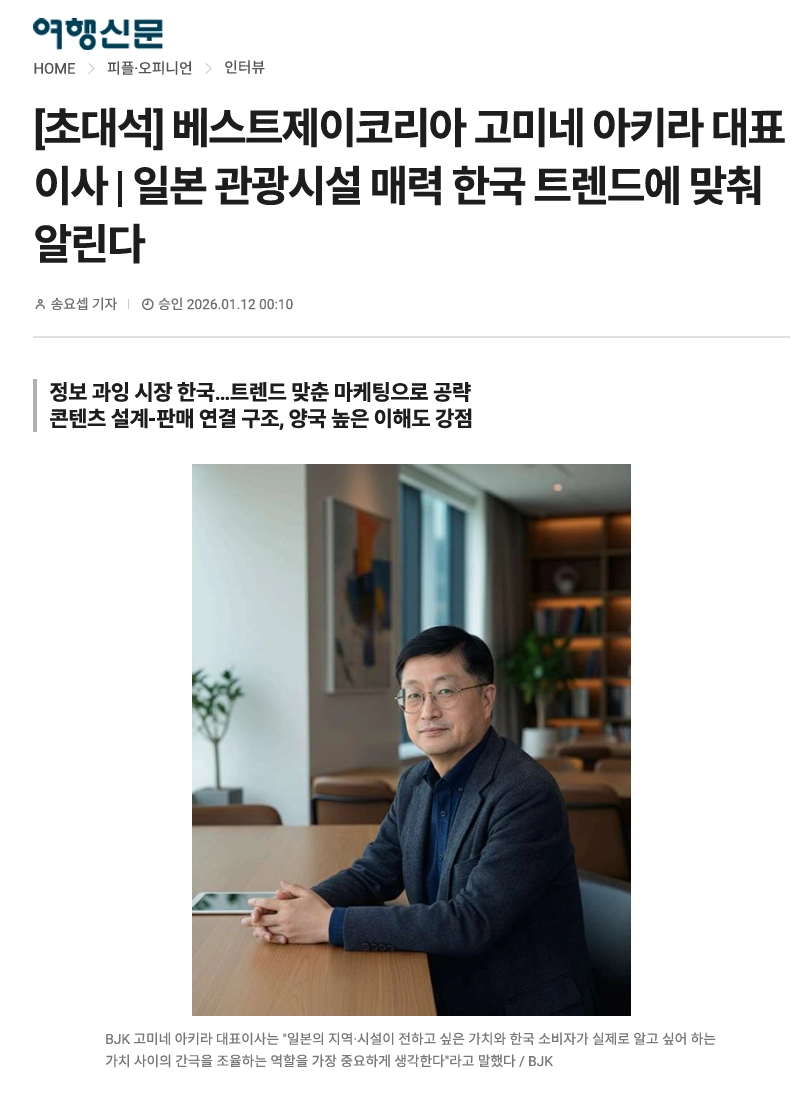 일본 여행 정보가 충분히 축적된 한국 시장에서 전략적인 마케팅 방식을 선보이며, 일본 방문으로 이어지게 만드는 기업이 있다. 마케팅·PR 전문 기업 베스트 제이코리아(BJK)다. BJK 고미네 아키라 CEO 이야기를 들었다.